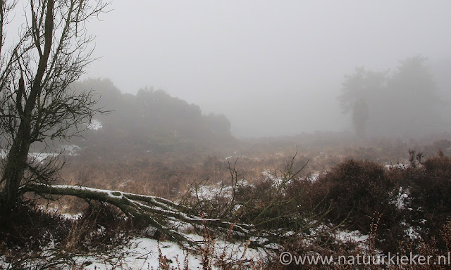 Ik vind sneeuw en mist een mooie combinatie, er had wat mij betreft nog wat meer sneeuw mogen liggen, maar het heeft ook wel iets speciaals dat de heidestruiken zo mooi donker in het landschap verschijnen. Het geeft contrast aan de foto en dat is boeiend evenals trouwens de sneeuw die wel op het ijs nog aanwezig was.